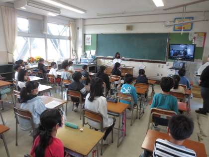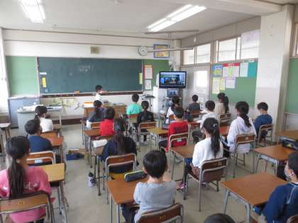 児童会発足式がテレビに生中継され、4年生は教室で式に参加しました。