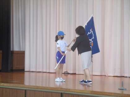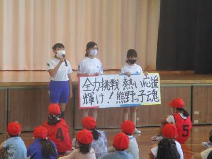 4月23日(金)、運動会の結団式を行いました。まず、運営委員会より、今年度の運動会のスローガン「全力挑戦 熱い応援 輝け! 熊野っ子魂」を発表した後、校長先生から各団長に団旗を渡していただきました。その後、各団のスローガンを発表しました。