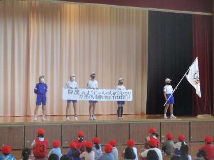 団役員の6年生は団の先頭に立ち、一人一人堂々と運動会の決意を述べていました。これからの活躍に期待しています。