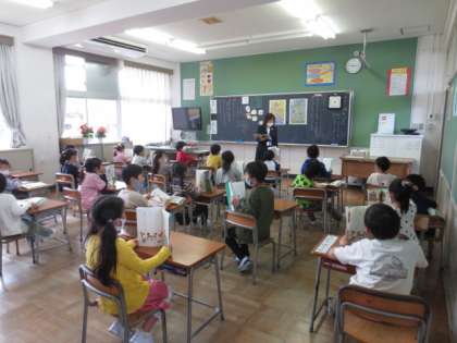 学校司書の先生に、図書室の使い方や本の場所を教えていただきました。図書室で本を借りるのを楽しみにしていた子供たちは、とてもわくわくした様子で、最初に借りる本を選びました。