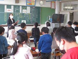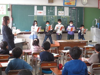 1限目に国語科の「きつつきの商売」の物語文を通して、場面の様子や登場人物の気持ちについて考え、話し合いを行いました。