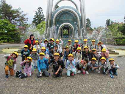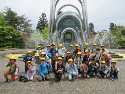 太閤山ランドの百年の泉の前で記念写真を撮りました。