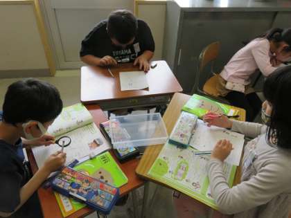 今年は、ホウセンカ、ヒマワリ、ピーマンの種を植えるので、その3つの種を観察しました。虫めがねを使いながら、熱心に観察をしていました。