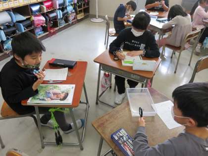 今年は、ホウセンカ、ヒマワリ、ピーマンの種を植えるので、その3つの種を観察しました。虫めがねを使いながら、熱心に観察をしていました。