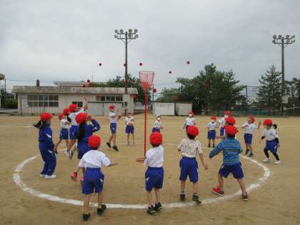 玉入れの練習が始まりました。2年生と一緒に、たくさん玉が入るように頑張っています。