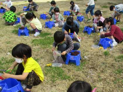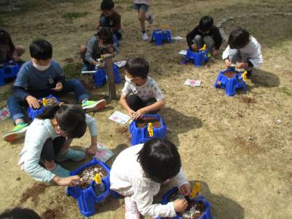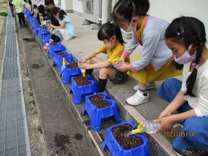 あさがおの種を植えました。子供たちは「おおきくなってね。」と話しかけながら、生長を楽しみに毎日水やりをしています。