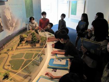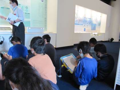 写真は、展示物を見学している様子です。資料館の方の解説を真剣に聞き入っていました。実際にイタイイタイ病を発症した患者の写真を見た子供たちは、大変驚いた様子でした。