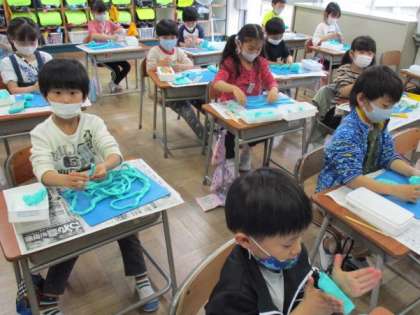 図画工作の時間では、「ひもひもねんど」の学習をしました。粘土を手のひらを使って紐状にし、思い付いた形を表しました。楽しく学習しました。