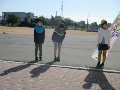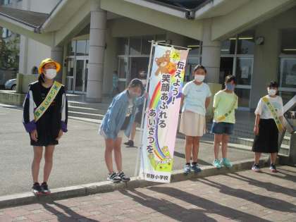 晴れた日は、あいさつの旗をもち、明るい挨拶、目と心をつないだ挨拶を響かせています。