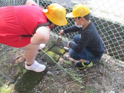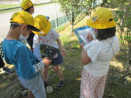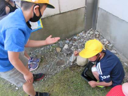 生活科の学習で虫探しをしました。学校の裏庭の石の下や花壇の近く、木の近くなどを探すと、ダンゴムシやアリ、バッタなど見つけることができました。見つけた虫はchromebookのカメラで記録しました。