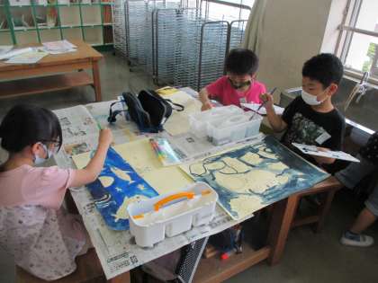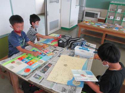 図画工作科では「ふしぎなたまご」の学習をしています。たまごの中からどんなものが出てくるのか考え、丁寧に色ぬりをしています。学習参観でぜひ子供たちの作品をご覧ください。