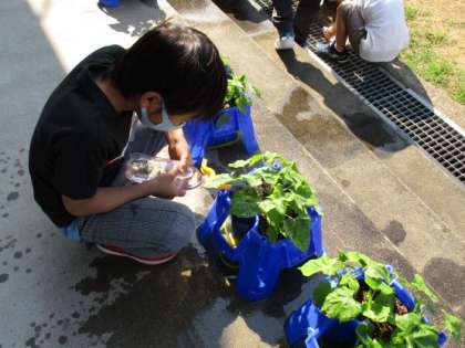 毎朝、アサガオの様子を観察し、水やりをしています。