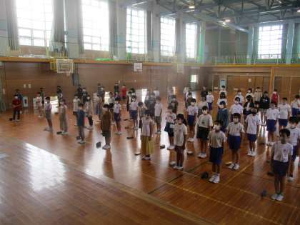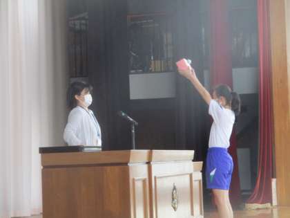 校長先生から代表児童がバッジを受け取り、晴れて6年生88名はクラブ員となりました。