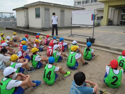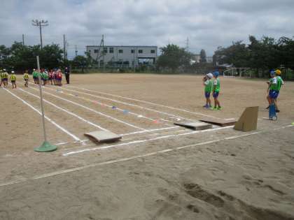 5年生では体育科で「自己ベストにチャレンジ!走り幅跳び」の学習を行っています。子供たちが自分の目当てに合わせ、助走・踏み切り・空中動作の3つのコースに分かれて練習を続けています。子供たちからは「高く跳ぶことを意識したら、遠くまで跳べるようになったよ」「助走の歩数が合ってきたので、手を挙げて跳ぶことを意識したい」など、さらなる目当てや技術の向上を目指す姿が見られました。