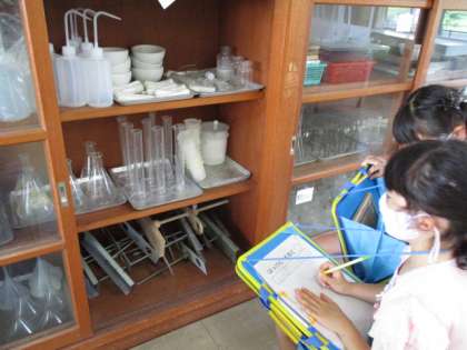 学校探検をしました。もっと知りたいと思う特別教室へ行き、教室にある物をじっくりと見たり、話を聞いたりしました。