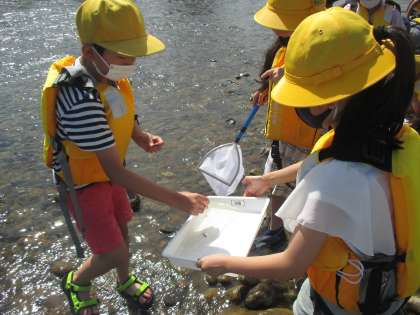 総合的な学習の時間では、熊野地域の環境について調べています。今日は熊野川へ行き、水質を調査しました。きれいな水を好む生き物がたくさん見付かり、熊野川の水はとてもきれいだということが分かりました。