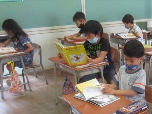 朝の読書タイムで、静かに本を読んでいます。図書室に行って、絵本や読み物の本を選んで借りてきています。