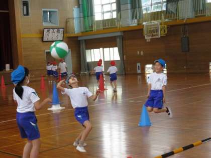 体育では、「キャッチアンドアタック」と称して、ビーチボールを使ったゲームを学習しています。相手がパスを受けやすいようにするには、ボールをどんな風に扱えばよいか考えながら、色団ごとに練習を重ねています。