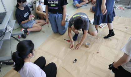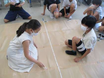 子供たちは、実際の寸法を詳しく調べて、紙に正確にかたどっていました。