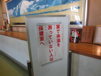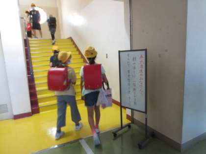 家で検温を忘れてきた子供は、保健室で検温をしてもらってから教室に行きます。登校時は、1階廊下がとても混雑するので、高学年は、玄関横の階段を上がって、密を避けるようにしています。