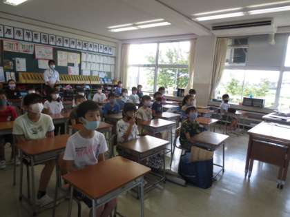 約1ヶ月ぶりに、子供たちの元気な姿が学校に戻ってきました。始業式に真剣に臨む姿からは、2学期もがんばろうという気持ちが伝わってきました。「スマイル&スクラム」で、学習や行事をがんばっていきたいと思います。