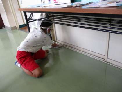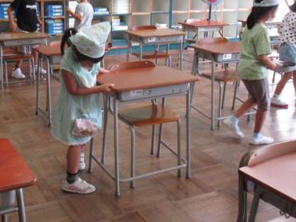 隅のほこりを取ったり、机を並べたりしています。