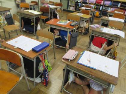 今日シェイクアウト訓練を行いました。シェイクアウト訓練とは、突然大きな地震が起きたときに、一斉に身を守るための行動をとる訓練です。「まず低く」「頭を守り」「動かない」を合い言葉とし、真剣に取り組むことができました。