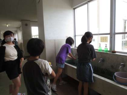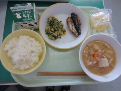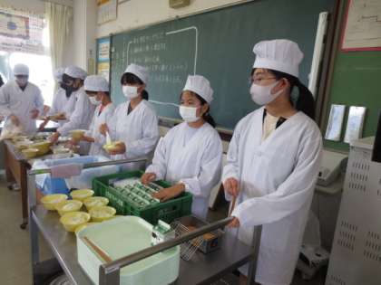 9月7日、今日の献立は、ごはん、牛乳、いわしの生姜味、コーン和え、大根の味噌煮込み、冷凍パインです。間をあけて手洗いをしたり、静かに盛りつけをしたりして、安全に気を付けて準備をしています。