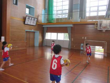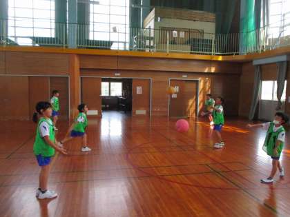 体育では、ボールを使って運動をしています。相手の胸に投げること、しっかりとキャッチをすることを目標に練習に励んでいます。