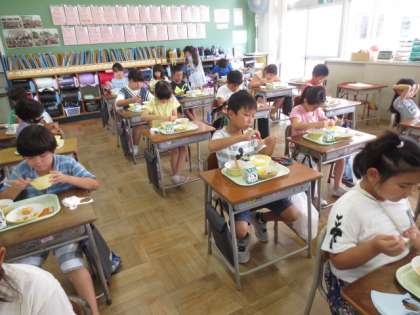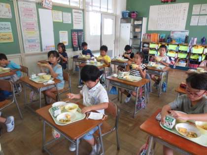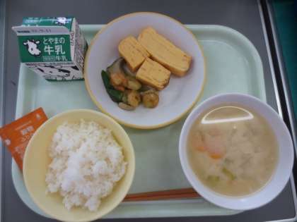 9月10日(金)の献立は、「ごはん、牛乳、厚焼き卵、えびときのこのガーリックソテー、呉汁、穀物ふりかけ」です。しゃべらず落ち着いて食べているので、よくかむようになった気がします。