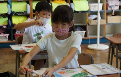 図画工作科では、お話から思い浮かべたことを絵に表しました。クレヨンや水彩で、描きました。