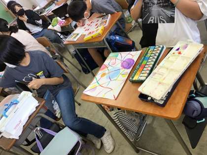 これまでに勉強した歴史の言葉から想像を広げ、感じたことを色や形で表しています。