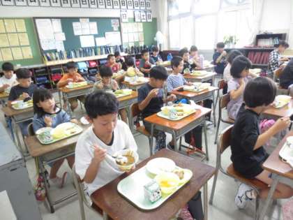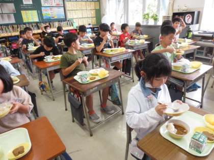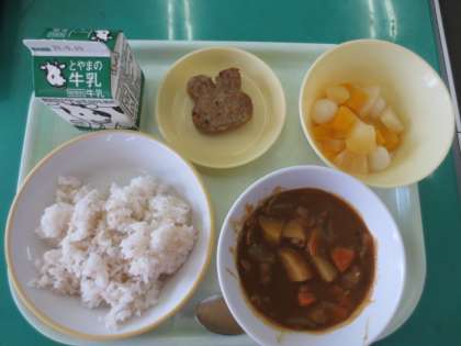 今日の献立は、「麦ご飯、牛乳、カレーライス、うさぎ形ハンバーグ、フルーツ白玉」です。うさぎの形をしたハンバーグに、大好きなカレーライス。3年生は、とてもうれしそうに食べていました。