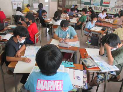 5年生の社会科では、「わたしたちのくらしと水産業」の学習に取り組んでいます。5年1組では、「漁業別の漁獲量の変化」を示すグラフから気付いたこと・分かったことを読み取る学習を行いました。写真は、個人で読み取ったことをグループで交流している様子です。