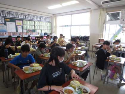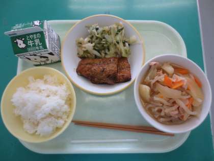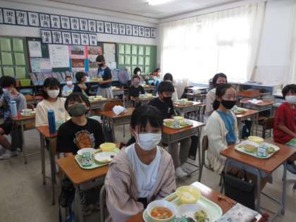 9月24日(金)の献立は、「ごはん、牛乳、さばのみりん焼き、おひたし、南蛮煮」です。6年生は、準備が整うまで、静かに待っています。涼しくなってきたので、煮物がおいしく感じられます。