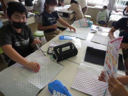 6年生は、ナップザックを作ります。今日は印付けをしています。この後、丈夫できれいに仕上がるように工夫しながら、ミシン縫いをします。仕上がりが楽しみです。