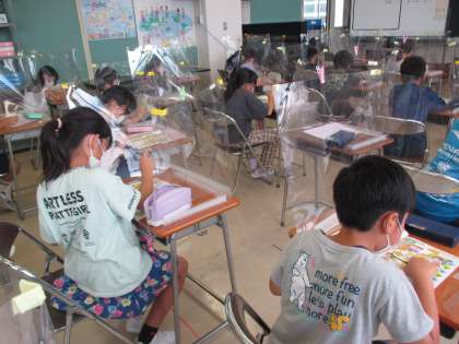 外国語活動では、アルファベットを学習しています。今日は、絵の中に隠れたアルファベットを探す活動をしました。大文字と小文字の形の違いに気を付けて探しました。