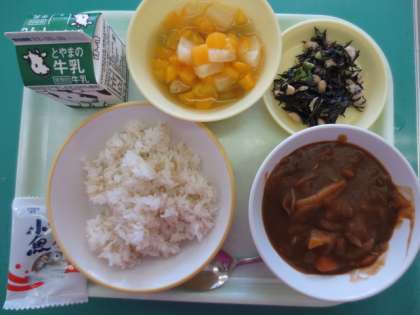 10月4日(月)の献立は、「麦ごはん、牛乳、食べキリンハヤシ、大豆とひじきのサラダ、フルーツゼリーミックス、味付け小魚」です。「食べキリン」とは、残さず食べきろうという意味で、SDGs(持続可能な社会つくるための目標)の一つにもなっています。