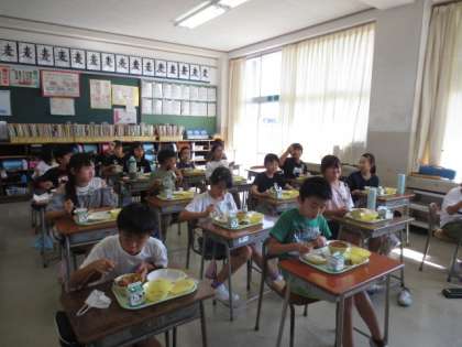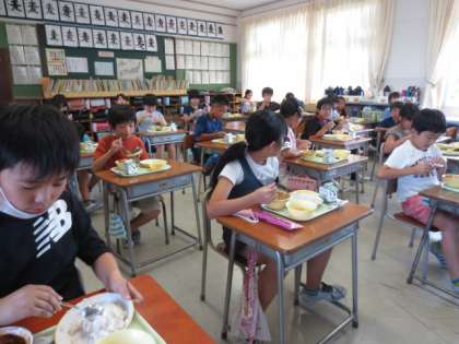 4年生の子供たちは、笑顔でおいしい給食を残さず食べていました。