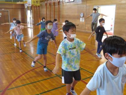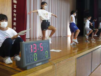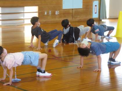 10月5日の体力つくり活動では、1年生が体育館で体幹トレーニングをしました。片足立ちでは、利き足と反対の足で立ったり、目をつぶったりして、レベルをだんだんあげました。運動委員会の手本が上手で驚きました。来週は2年生です。