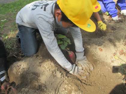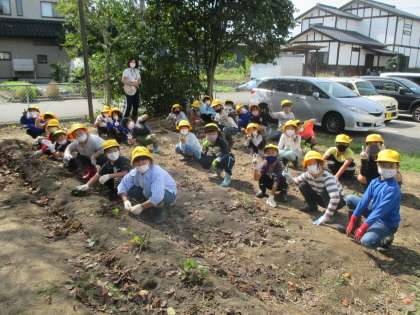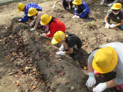 今日さつまいも堀りをしました。さつまいもを植えてから毎日水やりや草むしりなどを行い、子供たちは収穫する日を楽しみにしていました。大きなさつまいもが収穫できて、とても嬉しそうでした。