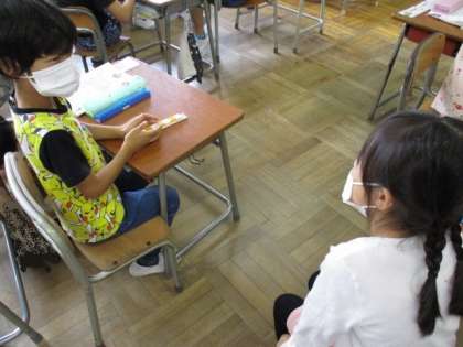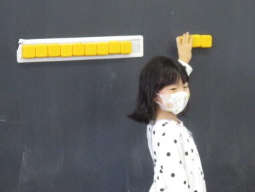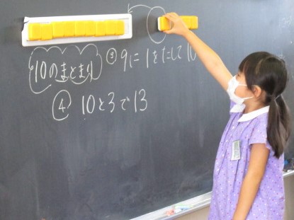 算数科では、たしざんを学習しています。ブロックを操作しながら、説明します。ペアの友達と聞き合ったり、みんなの前で自分の考えを説明したりしています。