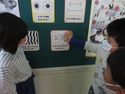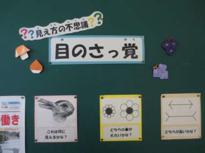 10月10日の「目の愛護デー」にあわせて、目の健康や錯覚を体験する絵が掲示してあります。子供たちは、目の働きを知ったり、同じ大きさのモンスターが目の錯覚で違って見えることに驚いたりしています。