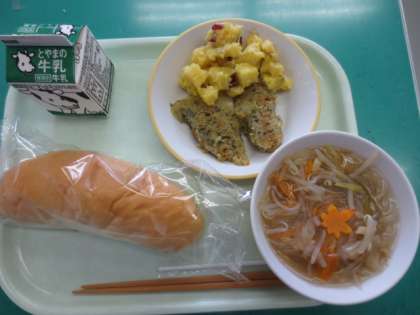 10月13日(水)の献立は「米粉コッペパン、牛乳、鱈の香草焼き、チーズおさつ、春雨スープ」です。サツマイモが秋を感じさせます。また、調理員さんが、秋らしく人参を紅葉の形にしてスープに浮かべてくれました。