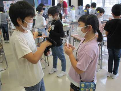 外国語活動では、アルファベットを学習しています。今日は、6文字の中から3文字を選んでカードに書き、「Do you have A?」と質問しながらカードを交換するゲームを行いました。