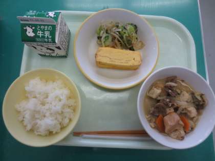 10月15日の献立は「ごはん、牛乳、厚焼き卵、おひたし、すき焼き」です。すき焼きには、肉、野菜、こんにゃく、焼き豆腐、麩等、たくさんの具材が入っているので、いろいろな味が出てとてもおいしかったです。