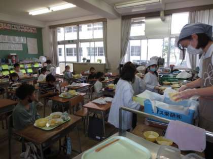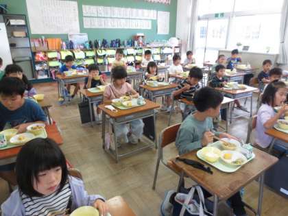 今日は、1年2組の様子です。入学して半年、手早く準備ができ、たくさん食べられるようになってきました。