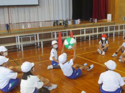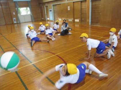 「シッティングバレー」は、おしりを床につけたままバレーボールを行います。最初はボールがつながりませんでしたが、練習を重ねるうちにだんだんとラリーが続くようになりました。