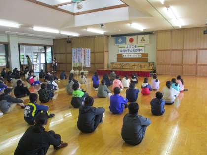 所長さんから、施設の使い方や協力して頑張ることの大切さなどを教えていただきました。代表の児童が、「グループの仲間と協力して頑張りたい」と挨拶しました。