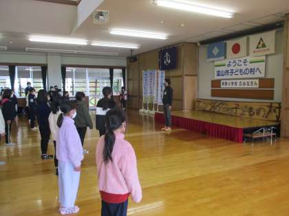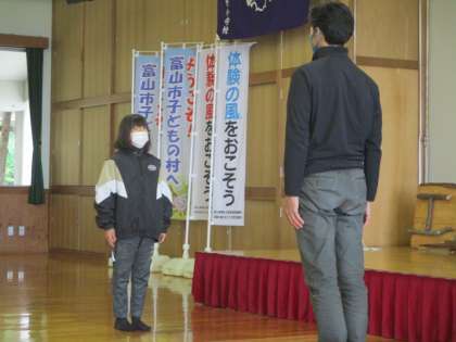 富山市野外教育活動センター(子どもの村)に到着し、入所式を行いました。